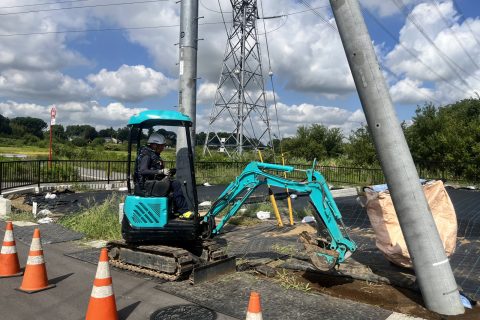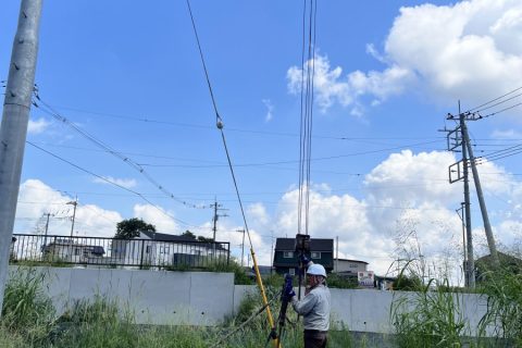 アンカーを打って吊り線で引っ張り、柱が倒れないようにするものです。