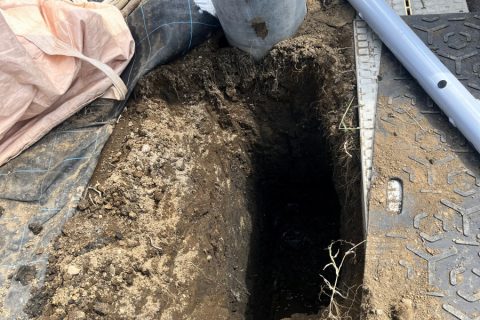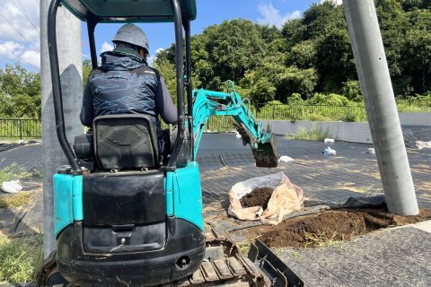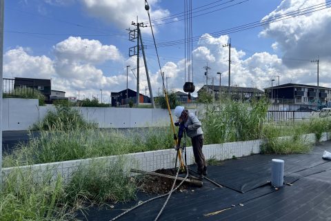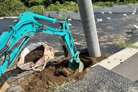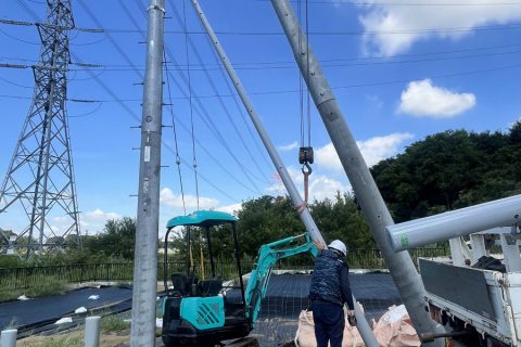 そして柱を吊り、穴の中に入れてから設置していきます。